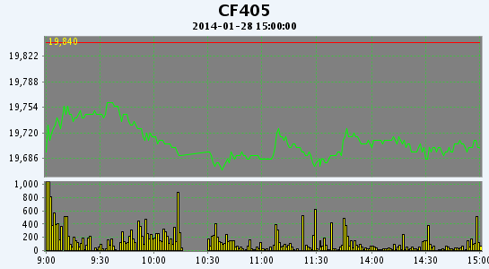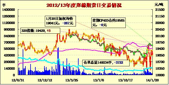 1月28日,鄭棉CF1405合約低開,早盤反彈后盤跌,日線形成低開陰線星,日內(nèi)成交量放大,持倉量減少。CF1405合約日成交31890手,日減倉2398手,終盤持倉量72680手;CF1409合約日成交2058手,日減倉472手,終盤持倉量23618手。