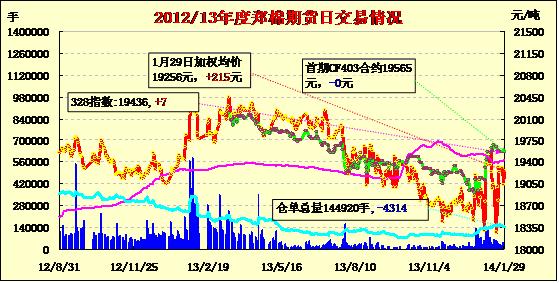 1月29日,鄭棉CF1405合約平開,早盤在空頭回補(bǔ)推動(dòng)下上沖,隨后區(qū)間整理,日線形成小陽線,日內(nèi)成交量萎縮,持倉量減少。CF1405合約日成交7978手,日減倉3286手,終盤持倉量69394手;CF1409合約日成交1310手,日減倉730手,終盤持倉量22888手?;久媲闆r:國內(nèi)各地大部分企業(yè)基本已停工放假。南疆主產(chǎn)區(qū)軋花廠大多有一定量的皮棉現(xiàn)貨沒有銷售,只能留到2月中下旬再銷售,由于數(shù)量少盡量選擇廠內(nèi)出貨。棉副市場產(chǎn)品報(bào)價(jià)穩(wěn)定,節(jié)前成交稀少,物流漸停,企業(yè)看好年后棉油、棉粕行情。