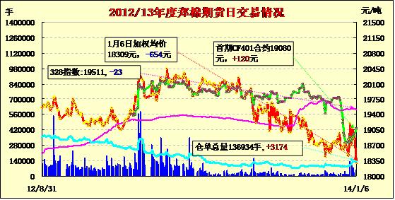 1月6日,鄭棉CF1405合約低開,盤中窄幅震蕩,午間在空頭回補(bǔ)與多頭買盤推動下上行,午后重心上移,高位換手量較大,尾盤在平空頭賣盤壓力下回落,日線形成低開陰線星,日內(nèi)成交量放大,持倉量增加。CF1405合約日成交29350手,日減倉2720手,終盤持倉量75696手;CF1409合約日成交6082手,日增倉830手,終盤持倉量27016手?;久媲闆r:近期國內(nèi)皮棉市場報價小幅上漲,但成交基本處于停滯;近期儲備投放成交比例有所回升,企業(yè)競拍目前仍舊較為謹(jǐn)慎;港口現(xiàn)貨目前以印度棉居多,報價在18000-18400元/噸不等,成交清淡。盛澤市場純滌紗個別品種價格小跌,32S主流在14100元/噸附近,45S主流在15200元/噸上下,21S小跌至13000元/噸左右。