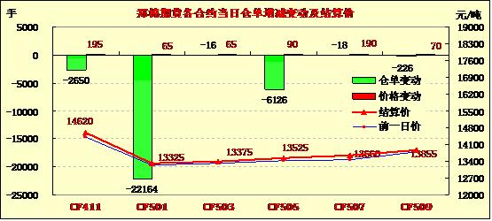10月10日,鄭棉CF1501合約低開,早盤下試后在多頭買盤推動下回升,盤中高位震蕩減倉,尾盤收于日內(nèi)次高點,日線形成陽線,日內(nèi)成交量萎縮,持倉量減少?;久媲闆r:國慶節(jié)后,河南南陽多數(shù)棉花收購企業(yè)仍以觀望為主,只有少量棉花企業(yè)開門收購。1228級收購報價2.7元/斤,2227級報價2.65元/斤,棉農(nóng)對當(dāng)前價格難以接受,交售不積極,偶有詢價,但無人交售。而棉企方面由于對當(dāng)?shù)?a href='http://www.qdhqly.cn/News/Channel/?CID=31' title='更多棉花信息' target='_blank'>棉花品級和質(zhì)量不看好,為了減少風(fēng)險,收購意愿也不強烈,市場進入僵持階段。