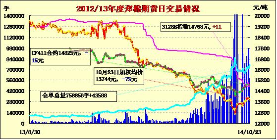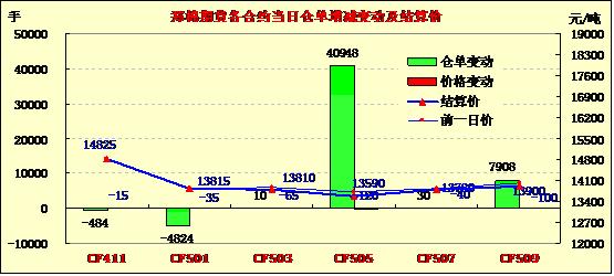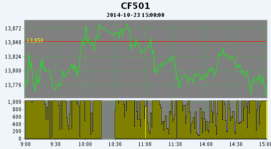 10月23日,鄭棉CF1501合約低開(kāi),早盤(pán)增倉(cāng)反抽,午后在平倉(cāng)盤(pán)壓制下走低,日線形成1/2上影線的小陰線,日內(nèi)成交量萎縮,持倉(cāng)量減少。
