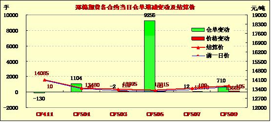 11月10日,鄭棉CF1501、1505合約平開,早盤沖高后窄幅震蕩,尾盤在平倉盤壓制下回落,日線形成小陽線,日內(nèi)遠(yuǎn)月成交量放大,持倉量增加。相關(guān)市場情況:上周五紐約棉花期貨收漲?;久媲闆r:11月10日邢臺當(dāng)?shù)匕酌?級籽棉收購價格為3.00元/斤(衣分率38%,回潮率13%以內(nèi)),白棉4級籽棉收購價格為2.90元/斤,較上周同期下降0.10元/斤。日前棉副產(chǎn)品行情保持穩(wěn)定態(tài)勢,棉籽銷售價格保持了穩(wěn)定,銷售價格為1.08元/斤,若按照3%虧損,加工費用1000元/噸計算,白棉3級折合生產(chǎn)成本為13450元/噸,白棉4級折合生產(chǎn)成本為12900元/噸。
