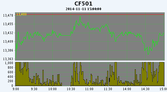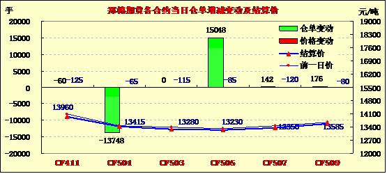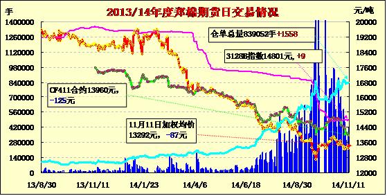 11月11日,鄭棉CF1501、1505合約低開,早盤反彈,隨后區(qū)間震蕩,午后一度下滑,尾盤在空頭回補(bǔ)盤支撐下反彈,日線形成低開小陽線,日內(nèi)遠(yuǎn)月成交量放大,持倉量增加。基本面情況:目前南疆多數(shù)地區(qū)籽棉采摘進(jìn)度接近尾聲,后期花上市量增多,籽棉價格小幅下滑,主流報(bào)價在6.0-6.2元/公斤,霜花則普遍低于6.0元/公斤,部分不足5.5元/公斤。阿克蘇市區(qū)、阿瓦提、巴楚等地仍然存在6.4元/公斤的高價,籽棉采摘進(jìn)度相對緩慢。近期下游紡企采購積極性難增,站臺成交整體來說不溫不火,目前白棉二、三級站臺主流提貨價在14500-14700元/噸,白棉二級花價格稍高100-200元/噸。近期南疆皮棉市場整體走量遲緩,因此軋花廠壓力繼續(xù)加重,近期停收或仍將增多。