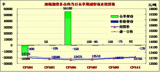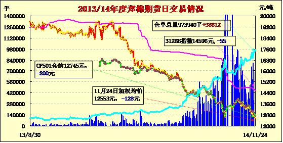 11月24日,鄭棉CF1501、1505合約低開,近月在多頭平倉(cāng)盤壓制下走低,遠(yuǎn)月受空頭賣盤打壓下再創(chuàng)新低,日線形成陰線,日內(nèi)成交量放大,持倉(cāng)量近減遠(yuǎn)增?;久媲闆r:近幾日連續(xù)下滑的市場(chǎng)行情,令新疆棉花企業(yè)也緊張起來(lái),拒收霜后花到停收,抓緊加工移庫(kù)。在南疆采購(gòu)的紡織廠也陸續(xù)撤出,想等待市場(chǎng)行情穩(wěn)定后再進(jìn)行采購(gòu)。當(dāng)前南疆采摘進(jìn)度完成95%左右,只有個(gè)別地區(qū)只完成70%左右,交售進(jìn)度70%,收購(gòu)價(jià)在5.5-6元/公斤,加工進(jìn)度完成60%左右。手摘棉站臺(tái)提貨價(jià)毛重在14200-14300元/噸,機(jī)采棉差距在500-600元/噸。汽運(yùn)成本仍較高,在1300元/噸左右,企業(yè)多轉(zhuǎn)鐵路運(yùn)輸,但鐵路運(yùn)輸仍較為緩慢。