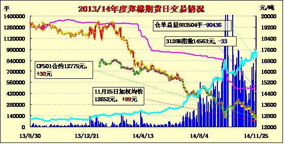 11月25日,鄭棉CF1501、1505合約低開,盤中在空頭回補推動下放量走高,日線形成長陽線,日內(nèi)成交量放大,持倉量大幅減少。基本面情況:因山東某大型紡織集團將3128B皮棉進價一次性下降400元/噸至13000元/噸及鄭州棉花期貨價格大跌影響,安慶棉區(qū)籽棉收購價格和皮棉銷售價格應(yīng)聲大跌,許多棉企直接將籽棉收購價格調(diào)到3.00元/斤,每斤籽棉價格較上周下跌了0.15元左右,不少棉企為規(guī)避風(fēng)險只好暫時停止了籽棉收購。面對突如其來的行情變化,有庫存皮棉的棉企主動出擊,紛紛下調(diào)皮棉銷售價格,大廠的4128B皮棉報價在13600元/噸,小廠4128B皮棉報價在13200元/噸,每噸較上周下跌了400-500元。本來目前安慶棉區(qū)的棉市漸趨穩(wěn)定,籽棉收購價格維持在3.00-3.20元/斤,皮棉銷售價格維持在13500-14200元/噸水平,市場購銷比較活躍,但這次價格的快速下跌讓棉企感受到了市場的殘酷,幾乎所有棉企都會形成虧損。據(jù)了解,幾家存有籽棉或皮棉較多的棉企虧損額要達到幾十萬元。此次行情的變化對大小棉企打擊很大,也將使棉市購銷比較活躍局面轉(zhuǎn)向冷清。