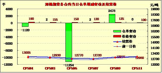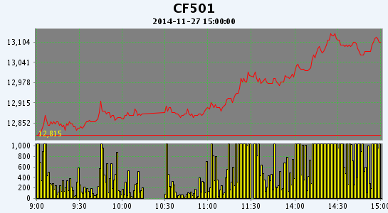 11月27日,鄭棉CF1501、1505合約高開,盤中大量換后,午后增量上行,日線形成小陽線,日內(nèi)成交量放大,持倉量減少?;久媲闆r:11月中旬以來,部分棉花加工企業(yè)因皮棉疆內(nèi)銷售進度大幅減緩,棉籽售價明顯低于預(yù)期。25-26日南疆庫爾勒、阿克蘇等棉區(qū)的籽棉收購價漸趨一致,40衣分、13%以內(nèi)水份霜后花的收購價降到5.6-5.8元/公斤,個別僵瓣子比較重、霜黃棉比例高或偏僻地區(qū)40衣分籽棉收購價跌破5.5元/公斤。但是由于擔(dān)心軋花廠隨時可能停收,降溫籽棉存儲困難等原因,售棉的積極性卻在“收尾前”高漲。