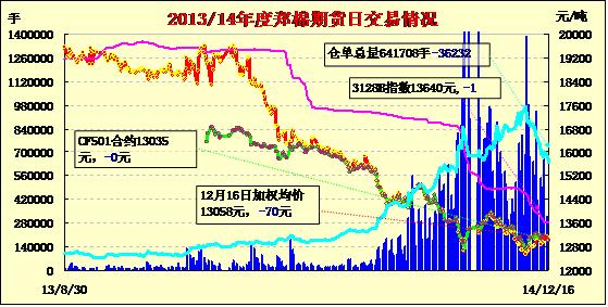 12月16日,鄭棉1505合約平開(kāi),盤(pán)中在多頭平倉(cāng)打壓下調(diào)整,尾盤(pán)受空頭回補(bǔ)推動(dòng)反彈,日線形成小陰線,日內(nèi)成交量變化不大,持倉(cāng)量減少?;久媲闆r:日前南疆在收籽棉主流報(bào)價(jià)5.5-5.6元/公斤,喀什、阿克蘇等地區(qū)部分優(yōu)質(zhì)中期花價(jià)格小幅回升至5.8-5.9元/公斤,但量已十分稀少,而后期霜花價(jià)格則比較混亂,部分或低于4.0元/公斤,在收軋花廠大多統(tǒng)花收購(gòu),每日收購(gòu)量較上周繼續(xù)減少。對(duì)于后期收購(gòu)計(jì)劃,軋花廠主要考慮的是降低自身成本,籽棉質(zhì)量要求更為嚴(yán)格。