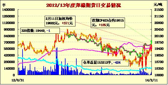 2月11日,鄭棉CF1405合約低開,早盤受多頭集中買盤推動沖高,隨后多頭平倉盤壓制期價波段下滑,日線形成長上影線的陰線,日內(nèi)成交量放大,持倉量先增后減。CF1405合約日成交49480手,日減倉1426手,終盤持倉量74338手;CF1409合約日成交4186手,日增倉62手,終盤持倉量21932手。基本面情況:春節(jié)假期期間港口外棉繼續(xù)常規(guī)到貨,節(jié)后這幾天入保稅倉庫的多為印度棉,其次是美棉,目前尚無買家提貨,除因貿(mào)易商及部分紡織廠還在休假外,貨車司機還沒有上班也是一個原因,預(yù)計正月十五以后情況會有所好轉(zhuǎn);目前下游恢復(fù)開工企業(yè)不多,整體來看成交情況清淡。