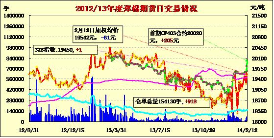 2月12日,鄭棉CF1405合約高開(kāi),早盤(pán)調(diào)整后震蕩回升,日線形成陽(yáng)線星,日內(nèi)成交量萎縮,持倉(cāng)量增加。CF1405合約日成交17908手,日增倉(cāng)578手,終盤(pán)持倉(cāng)量74916手;CF1409合約日成交1120手,日減倉(cāng)164手,終盤(pán)持倉(cāng)量21768手?;久媲闆r:目前保稅區(qū)港口庫(kù)存不多,大多為印度棉,美棉較少。近期外棉報(bào)價(jià)維持高位,企業(yè)大量訂貨意愿不高;下游開(kāi)工企業(yè)仍相對(duì)不多,生產(chǎn)未完全恢復(fù)。