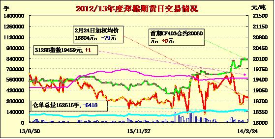 2月24日,鄭棉CF1405合約高開,盤中在多頭平倉打壓下震蕩下滑,午間加速,午后低位盤整,尾盤收低,日線形成低開長陰線,日內(nèi)成交量放大,持倉量減少。CF1405合約日成交23686手,日減倉2776手,終盤持倉量69202手;CF1409合約日成交2486手,日減倉78手,終盤持倉量21558手?;久媲闆r:目前港口進(jìn)口紗量較大,但買賣雙方心理價位存在差異,實際成交一般;港口外棉價格下跌,但成交仍舊有限,僅以少量成交為主;另外當(dāng)前直補政策引發(fā)各方關(guān)注。
