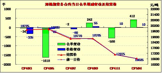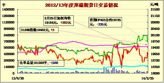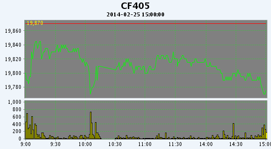 2月25日,鄭棉CF1405合約高開,早盤反彈后在多頭平倉打壓下震蕩盤跌,尾盤收低,日線形成小陰線,日內(nèi)成交量萎縮,持倉量減少。CF1405合約日成交14556手,日減倉1618手,終盤持倉量67584手;CF1409合約日成交1666手,日增倉242手,終盤持倉量21800手?;久媲闆r:國內(nèi)皮棉市場保持持穩(wěn),成交以少量的新疆棉為主;港口船期和保稅外棉成交清淡,港口現(xiàn)貨報價持穩(wěn),少量成交;下游需求仍舊不佳,企業(yè)訂單并不太好。