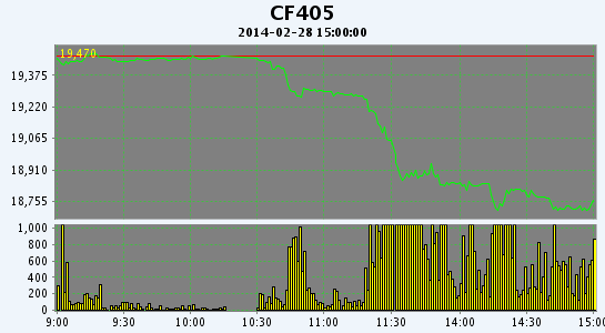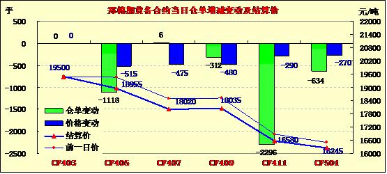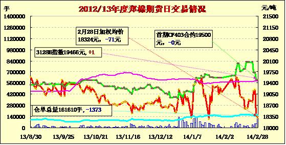 2月28日,鄭棉CF1405合約平開,早盤橫盤整理,午間在多頭集中平倉(cāng)盤打壓下走低,午后低位震蕩,遠(yuǎn)月收跌停,日線形成長(zhǎng)陰線,日內(nèi)成交量放大,持倉(cāng)量減少。CF1405合約日成交112192手,日減倉(cāng)1118手,終盤持倉(cāng)量66946手;CF1409合約日成交15532手,日減倉(cāng)312手,終盤持倉(cāng)量22120手?;久媲闆r:近期市場(chǎng)上對(duì)于3月之后拋儲(chǔ)政策以及新年度新疆直補(bǔ)政策尤為關(guān)注;據(jù)貿(mào)易商反應(yīng),港口雖然近日買家詢盤看貨不少,但銷售情況仍不樂觀。買家認(rèn)為棉價(jià)還會(huì)繼續(xù)下行,觀望情緒仍然濃烈。