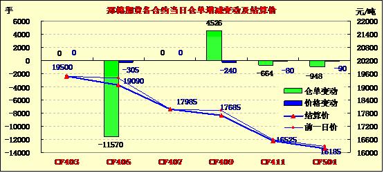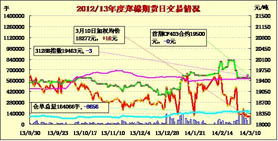 3月10日,鄭棉CF1405合約低開,盤中在多頭平倉盤打壓下快速下滑,午后略有反彈,日線形成長陰線,日內(nèi)成交量放大,持倉量減少。CF1405合約日成交51016手,日減倉11570手,終盤持倉量57566手;CF1409合約日成交30168手,日增倉4526手,終盤持倉量35324手?;久媲闆r:國內(nèi)皮棉現(xiàn)貨市場主要以少量新疆棉為主,成交清淡。企業(yè)拍儲熱情普遍不高,觀望情緒較重;港口外棉現(xiàn)貨難以走銷,部分銷售印度棉的現(xiàn)貨商小幅下調(diào)價格,船期外棉銷售維持清淡。