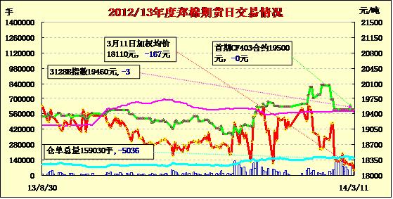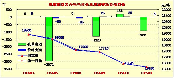 3月11日,鄭棉CF1405合約低開,早盤反彈,午后在集中平倉盤打壓下走低,日線形成陰線星,日內成交量萎縮,持倉量減少。CF1405合約日成交22726手,日減倉2972手,終盤持倉量54594手;CF1409合約日成交12088手,日增倉1328手,終盤持倉量33996手。