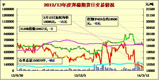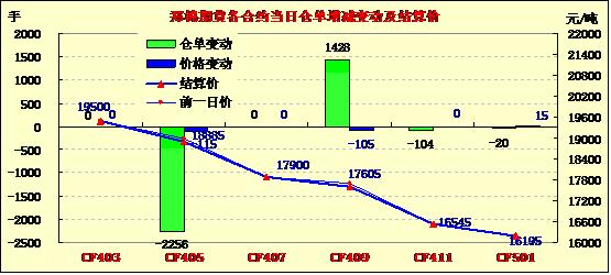 3月12日,鄭棉CF1405合約低開(kāi),早盤(pán)反彈后在平倉(cāng)盤(pán)壓制下走低,日線形成長(zhǎng)上影線的陰線,日內(nèi)成交量萎縮,持倉(cāng)量減少。CF1405合約日成交15926手,日減倉(cāng)2256手,終盤(pán)持倉(cāng)量52338手;CF1409合約日成交13582手,日增倉(cāng)1428手,終盤(pán)持倉(cāng)量35424手。基本面情況:儲(chǔ)備棉投放成交以及港口現(xiàn)貨成交均表現(xiàn)清淡,企業(yè)觀望情況較重,大多在等待政策明朗后再行決定,當(dāng)前還是以隨用隨購(gòu)的為主。