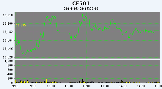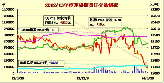 3月20日,鄭棉CF1405合約平開,早盤整理后沖高,隨后盤跌下滑,日線形成長上影線的陽線星,日內(nèi)成交量萎縮,持倉量減少。CF1405合約日成交3852手,日減倉952手,終盤持倉量46766手;CF1409合約日成交11056手,日減倉2760手,終盤持倉量36576手?;久媲闆r:下游需要仍舊不佳,買家心理價(jià)位偏低,棉紗價(jià)格有所下跌,整體成交清淡;港口現(xiàn)貨報(bào)價(jià)繼續(xù)維持高位,買家興趣平平,成交基本處于停滯。