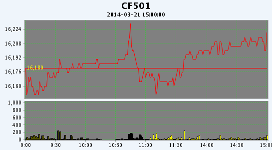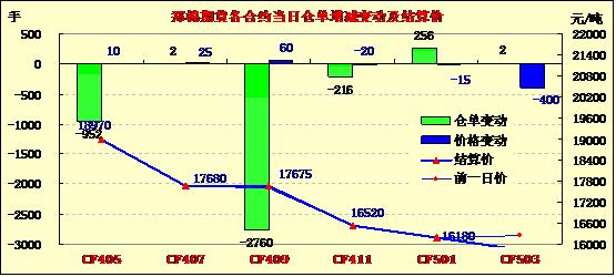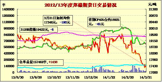 3月21日,鄭棉CF1405合約平開(kāi),早盤(pán)窄幅整理,午間一度過(guò)下滑,午后在空頭回補(bǔ)支撐反彈,日線形成小陰線,日內(nèi)成交量萎縮,持倉(cāng)量減少。CF1405合約日成交3322手,日減倉(cāng)610手,終盤(pán)持倉(cāng)量46156手;CF1409合約日成交12126手,日增倉(cāng)1482手,終盤(pán)持倉(cāng)量38058手?;久媲闆r:目前不少貿(mào)易商降價(jià)促銷(xiāo)港口庫(kù)存,但由于紡織廠目前正等待政策落地,采購(gòu)謹(jǐn)慎,市場(chǎng)實(shí)際成交較少;港口外紗價(jià)格仍維持一定跌勢(shì),部分貿(mào)易商出貨意愿開(kāi)始加重。