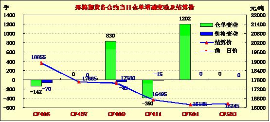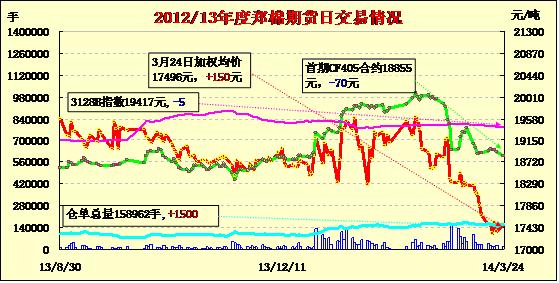 3月24日,鄭棉CF1405合約低開,早盤窄幅整理,尾盤在利空消息影響下快速下滑,日線形成陰線,日內(nèi)成交量變化不大,持倉量減少。CF1405合約日成交3714手,日減倉142手,終盤持倉量46014手;CF1409合約日成交10830手,日增倉830手,終盤持倉量38888手?;久媲闆r:全棉紗價格以零星走貨為主,整體觀望情緒濃重,普遍對后市不看好;企業(yè)目前原料采購意愿不高,即期需求采購,基本在等政策面明朗后,再行決定。今日最新消息稱,為了保證紡織企業(yè)用棉需求,有關(guān)部門決定自4月1日起調(diào)整儲備棉投放政策,標準級競賣底價將由18000元/噸調(diào)整為17250元/噸,具體方案將于近日公布。