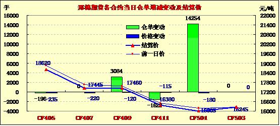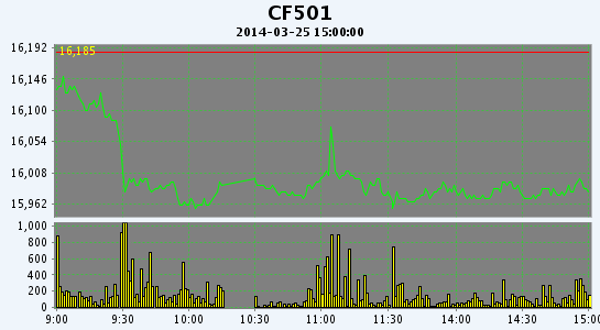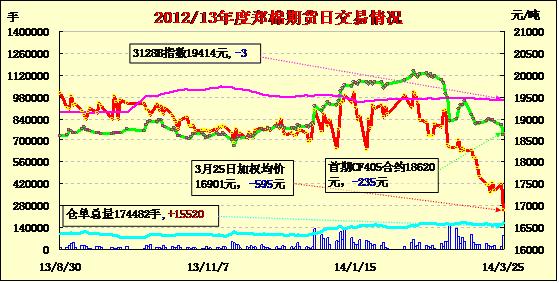 3月25日,鄭棉CF1405合約大幅低開,盤中在空頭逢低回補(bǔ)支撐下反彈,日線形成低開陽線,日內(nèi)成交量放大,持倉量減少。CF1405合約日成交6562手,日減倉196手,終盤持倉量45818手;CF1409合約日成交41158手,日增倉3084手,終盤持倉量41972手?;久媲闆r:有關(guān)部門決定自4月1日起,標(biāo)準(zhǔn)級競賣底價(jià)將由18000元/噸調(diào)整為17250元/噸;港口外棉人民幣報(bào)價(jià)相對持穩(wěn),美金報(bào)價(jià)近期有所上漲,整體來看,很少有成交。