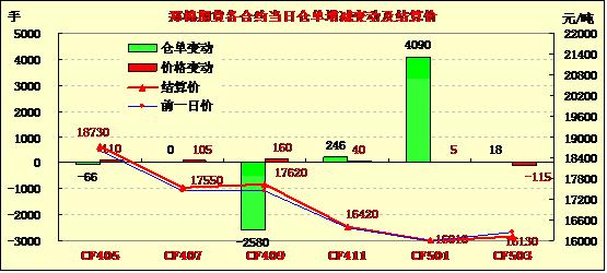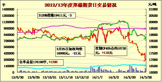 3月26日,鄭棉CF1405合約高開,盤中在平倉盤壓制下盤跌,日線形成高開陰線,日內(nèi)成交量萎縮,持倉量變化不大。CF1405合約日成交2542手,日減倉66手,終盤持倉量2542手;CF1409合約日成交13328手,日減倉2508手,終盤持倉量39392手。