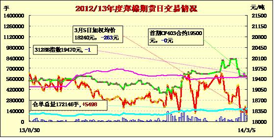3月5日,鄭棉CF1405合約高開,盤中區(qū)間震蕩,尾盤減倉(cāng)收高,日線形成長(zhǎng)下影線的陽(yáng)線星,日內(nèi)成交量萎縮,持倉(cāng)量增加。CF1405合約日成交19644手,日減倉(cāng)1536手,終盤持倉(cāng)量73128手;CF1409合約日成交9700手,日增倉(cāng)1546手,終盤持倉(cāng)量26102手。