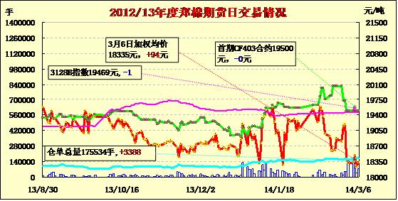 3月6日,鄭棉CF1405合約低開(kāi),早盤沖高回落,午后再度回升,日線形成長(zhǎng)陽(yáng)線星,日內(nèi)成交量放大,持倉(cāng)量減少。CF1405合約日成交37956手,日減倉(cāng)1118手,終盤持倉(cāng)量72010手;CF1409合約日成交30516手,日增倉(cāng)3838手,終盤持倉(cāng)量29940手?;久媲闆r:近期企業(yè)競(jìng)賣儲(chǔ)備棉熱情并不高,基本是基于即期需求,少量競(jìng)賣;港口現(xiàn)貨難以銷售,一些印度棉現(xiàn)貨商降價(jià)拋售,船期銷售也基本很少;港口外紗報(bào)價(jià)略有下跌,但是據(jù)了解,走貨也并不好。