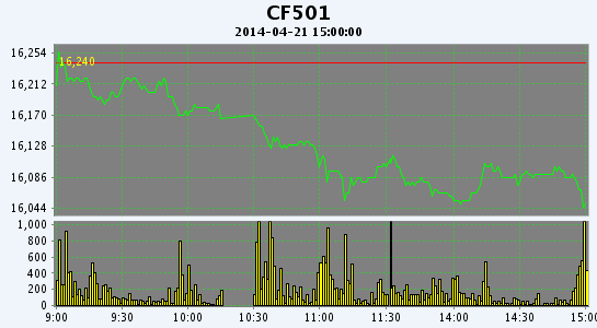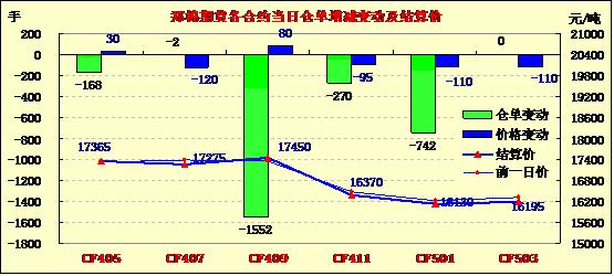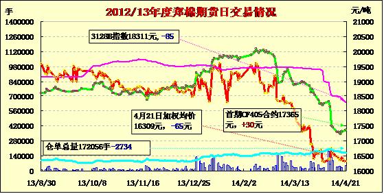 4月21日,鄭棉CF1501合約平開,盤中震蕩下滑,日線形成陰線,日內(nèi)成交量放大,持倉量減少。CF1409合約日成交6542手,日減倉1552手,終盤持倉量35524手;CF1501合約日成交43484手,日減倉742手,終盤持倉量117026手?;久媲闆r:,白銀棉業(yè)信息中心前往河南南陽地區(qū)進行春播調(diào)研,了解到當?shù)?a href='http://www.qdhqly.cn/News/Channel/?CID=31' title='更多棉花信息' target='_blank'>棉花種植面積逐年下降,今年較去年減少一半以上,部分棉農(nóng)開始育苗;由于當?shù)刈衙拶Y源有限,且國家不再收儲,部分加工廠前往新疆包廠或轉(zhuǎn)行。