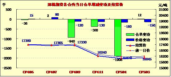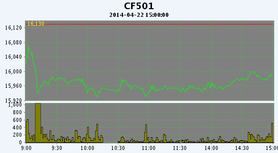 4月22日,鄭棉CF1501合約小幅低開,早盤反彈后在平倉(cāng)盤壓制下回落,此后低位盤整,尾盤受到短線回補(bǔ)買盤支撐回升,日線形成陰線星,日內(nèi)成交量萎縮,持倉(cāng)量減少。CF1409合約日成交7860手,日減倉(cāng)940手,終盤持倉(cāng)量34584手;CF1501合約日成交26210手,日減倉(cāng)1906手,終盤持倉(cāng)量115120手。