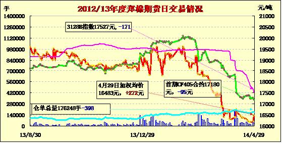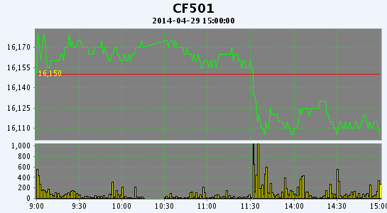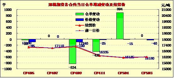 4月28日,鄭棉CF1501合約高開,早盤調(diào)整后在多頭買盤推動下走高,此后高位震蕩,日線形成高開陽線,日內(nèi)成交量放大,持倉量增加。CF1409合約日成交2028手,日減倉340手,終盤持倉量33006手;CF1501合約日成交43372手,日增倉10510手,終盤持倉量125050手。