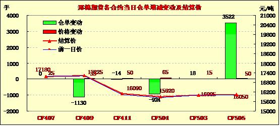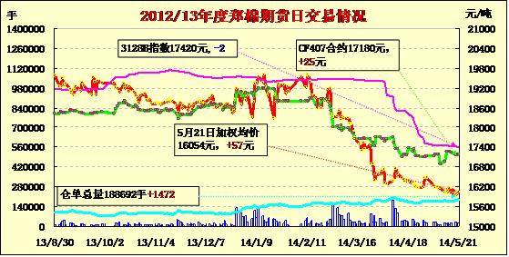 5月21日,鄭棉CF1501合約低開,盤中在空頭回補與多頭買盤支撐下反彈,午后受到空頭賣盤壓制調(diào)整,日線形成1/2上影線的陽線,日內(nèi)成交量放大,持倉量減少。