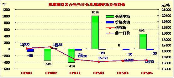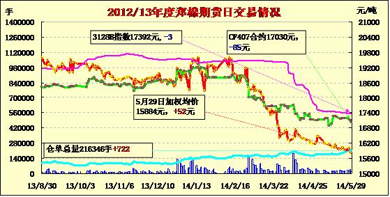 5月29日,鄭棉CF1501合約低開(kāi),早盤(pán)反彈增倉(cāng)震蕩,午后下滑,尾盤(pán)在多頭買(mǎi)盤(pán)推動(dòng)下反彈,日線形成小陽(yáng)線,日內(nèi)成交量萎縮,持倉(cāng)量增加?;久媲闆r:純棉產(chǎn)品市場(chǎng)仍然清淡,織布廠和服裝廠對(duì)純棉紗需求極少,純棉紗行情弱勢(shì)調(diào)整,市場(chǎng)略顯信心不足。棉副產(chǎn)品漲跌互現(xiàn),但幅度仍然不大。棉籽價(jià)格穩(wěn)定,局部上漲,但收購(gòu)量有限,棉油穩(wěn)中走弱,棉殼有所回落。