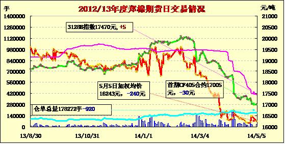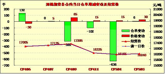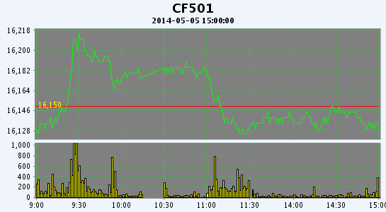 5月5日,鄭棉CF1501合約平開(kāi),早盤(pán)受多頭買(mǎi)盤(pán)推動(dòng)上沖,午后在平倉(cāng)盤(pán)壓制下回落,日線形成1/2上影線的小陰線,日內(nèi)成交量溫和放大,持倉(cāng)量減少。CF1409合約日成交1808手,日減倉(cāng)320手,終盤(pán)持倉(cāng)量33312手;CF1501合約日成交26566手,日減倉(cāng)636手,終盤(pán)持倉(cāng)量126876手。