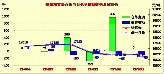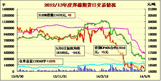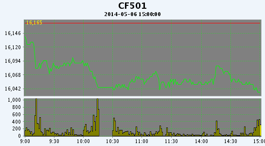 5月6日,鄭棉CF1501合約高開,早盤在多頭平倉壓制下調(diào)整,隨后逢低買盤支撐期價(jià)止跌震蕩,日線形成陰線,日內(nèi)成交量變化不大,持倉量增加。CF1409合約日成交2926手,日增倉388手,終盤持倉量33700手;CF1501合約日成交25404手,日增倉966手,終盤持倉量127842手?;久媲闆r:當(dāng)前全國春播進(jìn)度加快,其中長(zhǎng)江流域局部棉區(qū)出現(xiàn)連陰雨影響棉花移栽。隨著長(zhǎng)江流域小麥以及油菜收割加快,下周棉花會(huì)大批量移栽。棉副方面,地方上的油廠因油菜收割而開始收購。外圍產(chǎn)品行情大幅走低。棉副產(chǎn)品價(jià)格漲跌不一。部分地區(qū)棉籽價(jià)格重心有所上移,但成交仍然稀少。