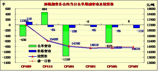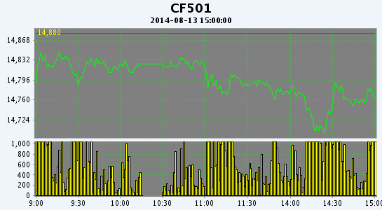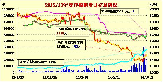 8月13日,鄭棉CF1501合約低開,盤中橫向盤整,午后在多頭平倉盤打壓下走低,尾盤受到短線回補盤支撐反彈,日線形成低開陰線星,日內(nèi)成交量萎縮,持倉量減少?;久媲闆r:據(jù)調(diào)查,8月上中旬南疆阿克蘇、喀什等棉區(qū)天氣以多云、小雨為主,氣溫維持在18-31度,較往年同期氣溫稍低1-2度,雖然底部已普遍坐桃3-4個,伏期花已大量現(xiàn)蕾,從時間來看雖較去年落后7-10天但長勢較好,一些農(nóng)民認為今年閏九月,盡管積溫有些偏低,但并不會影響棉花吐絮、采摘以及單產(chǎn)。阿瓦提、沙雅、柯坪等地長絨棉的長勢和坐桃率要明顯好于2013年,若8月中下旬至9月上旬不出現(xiàn)較大的自然災害且及時采摘、搶收,長絨棉單產(chǎn)有望同比提高5%-10%,相比細絨棉軋花廠,長絨棉企業(yè)檢修機器,維修消防設備、計劃9月上中旬開秤的比例要明顯高很多。