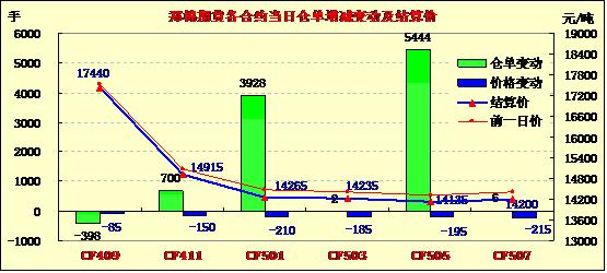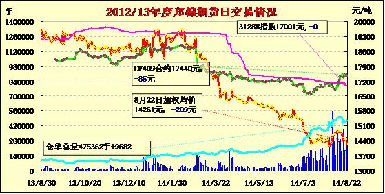 8月22日,鄭棉CF1501合約低開,早盤增倉下跌,此后低位震蕩,尾盤在周末空頭回補盤的推動下反彈,日線形成1/3下影線的陰線,日內(nèi)成交量放大,持倉量增加?;久媲闆r:據(jù)阿克蘇沙雅、喀什巴楚等地一些軋花廠反映,進入8月下旬,大部分棉田進入盛花期,中期花已開始坐桃,蓋頂花也大量出現(xiàn),棉株一般結(jié)桃8-12個,個別品種、打頂不徹底的棉花高度達到1.3-1.5米;底桃已陸續(xù)吐絮,預(yù)計9月上中旬農(nóng)民將開始少量采摘,但難以形成規(guī)模,預(yù)計籽棉集中采摘需要到9月下旬至10月中旬,軋花廠放量收購也將集中在9月下旬至11月中旬。