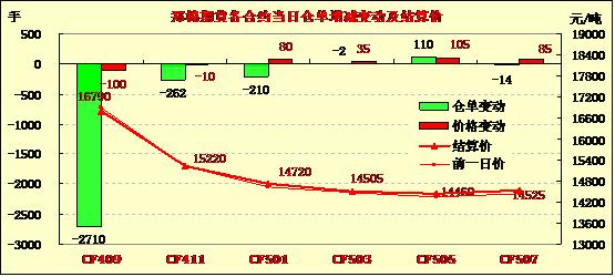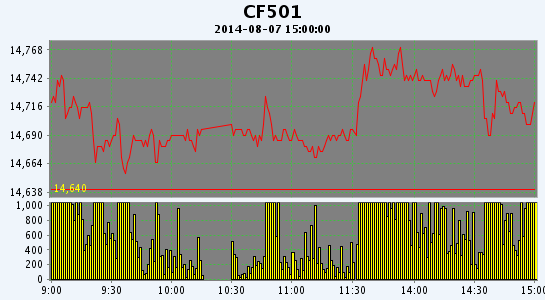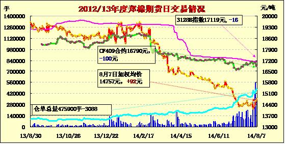8月7日,鄭棉CF1501合約小幅高開,早盤調(diào)整后低位震蕩,午后一度上沖,隨后在集中平倉盤打壓下回落,日線形成陽線星,日內(nèi)成交量萎縮,持倉量減少?;久媲闆r:進入8月上旬,新疆阿克蘇的沙雅、阿瓦提、庫車、柯坪等地伏桃已陸續(xù)現(xiàn)蕾,棉株高度達到85-110厘米,底部坐桃普遍達到3-4個,由于今年“新陸中”系列為主,棉花表現(xiàn)為植株少、高度高、桃子較大。而黃河流域大部分棉區(qū)有點干旱,新棉目前長勢較好。長江流域江蘇、湖北、湖南、安徽7月降雨較多,進入8月天氣情況良好,溫度較高,目前新花長勢良好。