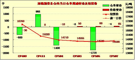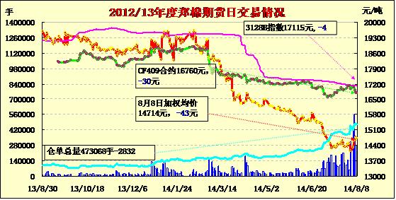 8月8日,鄭棉CF1501合約小幅低開,盤中窄幅震蕩,日線形成陽線星,日內(nèi)成交量萎縮,持倉量減少?;久媲闆r:河北的紡織企業(yè)競(jìng)拍積極性略有增加,現(xiàn)貨報(bào)價(jià)暫時(shí)保持了穩(wěn)定態(tài)勢(shì);當(dāng)?shù)孛藁ㄩL勢(shì)較好,預(yù)計(jì)9月上旬能夠零星采摘,但棉花企業(yè)依舊比較茫然,棉企心態(tài)不一迎接籽棉收購工作。