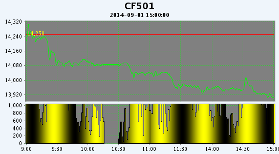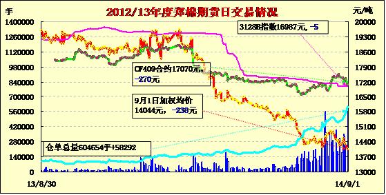 9月1日,鄭棉CF1501合約平開(kāi),早盤(pán)反彈后在空頭賣(mài)盤(pán)壓制下增倉(cāng)走低,午后擊穿前期低點(diǎn),終盤(pán)收于日低,日線形成長(zhǎng)陰線,日內(nèi)成交量放大,持倉(cāng)量增加?;久媲闆r:當(dāng)前內(nèi)地一些棉區(qū)棉農(nóng)零星采摘棉花,籽棉質(zhì)量相對(duì)較好,棉農(nóng)期望的價(jià)格比較高存在惜售心理,當(dāng)前小軋花廠少量收購(gòu)籽棉,加工成新棉少量銷(xiāo)售給一些小的紡織企業(yè)。據(jù)了解,湖北地方協(xié)會(huì)和企業(yè)開(kāi)會(huì)研究地方棉花差價(jià)補(bǔ)貼,當(dāng)前就補(bǔ)貼落實(shí)方案進(jìn)行商討。多數(shù)企業(yè)對(duì)后市比較迷茫,目前觀望為主。