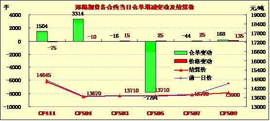 9月16日,鄭棉CF1501合約低開,早盤反彈,午間在空頭賣盤打壓下走低,隨后受到短線空頭回補(bǔ)盤推動回升,日線形成陽線星,日內(nèi)成交量萎縮,持倉量增加。基本面情況:目前正值新花集中采摘時節(jié),但自上周四(9月11日)始,山東各地多現(xiàn)陰雨低溫天氣,后持續(xù)小雨、或中雨不斷,中間或有多云天氣(周六),其它幾天仍以低溫陰雨天氣為主,已持續(xù)五天時間。據(jù)悉,此次降雨,山東各棉產(chǎn)區(qū)均較普遍,溫度在13-20℃,部分地區(qū)在雨前對吐絮棉桃及時進(jìn)行了采摘,葉絮棉未受到多少影響,一些未能及時采摘的吐絮棉或半吐絮棉卻遭遇了雨淋命運(yùn),其質(zhì)量與雨前已大幅降低。天氣預(yù)報稱,未來山東地區(qū)仍是陰雨低溫天氣,預(yù)計要持續(xù)到9月18日(周四)。