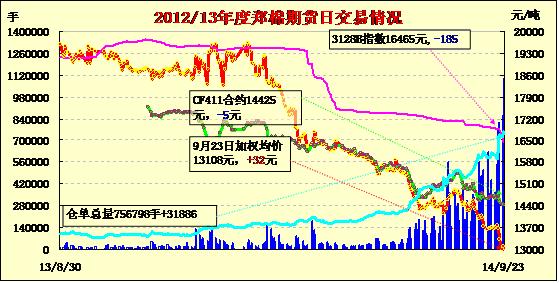 9月23日,鄭棉CF1501合約低開(kāi),早盤(pán)探低后在多頭買(mǎi)盤(pán)推動(dòng)下震蕩上行,尾盤(pán)在平倉(cāng)盤(pán)壓制下調(diào)整,日線形成陽(yáng)線,日內(nèi)成交量放大,持倉(cāng)量增加?;久媲闆r:目前河北邢臺(tái)的籽棉采摘工作已經(jīng)超過(guò)三分之一多,采摘的籽棉質(zhì)量較好,但是由于今年多數(shù)棉企推遲開(kāi)秤時(shí)間,棉農(nóng)比較擔(dān)憂出售工作;另外比較激進(jìn)的棉企已經(jīng)開(kāi)始產(chǎn)出皮棉,但是隨著棉花行情的日漸下跌,棉企皮棉銷售難度較大。