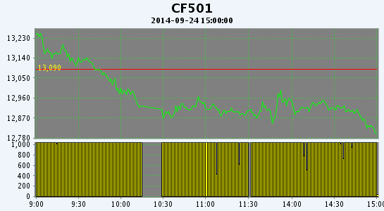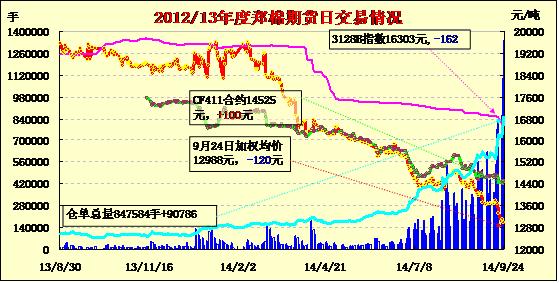 9月24日,鄭棉CF1501合約平開,早盤沖高減倉(cāng),隨后在空頭集中賣盤打壓下迅速下滑,午后低位震蕩,尾盤收于日低,日線形成長(zhǎng)陰線,日內(nèi)成交量創(chuàng)新高,持倉(cāng)量大幅增加。基本面情況:據(jù)調(diào)查,今年南疆阿克蘇、喀什等地棉花拾花費(fèi)上漲并不明顯,細(xì)絨棉集中在2-2.2元/公斤,長(zhǎng)絨棉2.6-2.8元/公斤,阿瓦提、沙雅因棉花資源比較集中,拾花工短缺比較嚴(yán)重,拾花價(jià)格較其它地區(qū)略高0.1-0.2元/公斤。由于今年前期氣溫低,9月中旬以來又從北至南遭遇較大幅度降溫、降雨天氣,籽棉吐絮、采摘較往年推遲20天以上,預(yù)計(jì)10月上中旬才能迎來大規(guī)模采摘,但因很多種植大戶雇傭的拾花工紛紛在9月15日前到位(動(dòng)手晚了很難雇到拾花人員),為了有收入,拾花人員剝棉桃、僵瓣棉較多,不僅籽棉水分大而且成熟度不夠,軋花廠拒收的情況經(jīng)常出現(xiàn)。