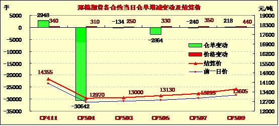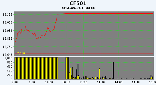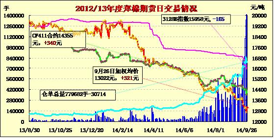 9月26日,鄭棉CF1501合約平開,早盤區(qū)間震蕩,隨后在空頭集中回補(bǔ)推動下大幅上揚(yáng)并封于漲停,日線形成長陽線,日內(nèi)成交量創(chuàng)下降,持倉量大幅減少。基本面情況:以往年度,湖北地區(qū)棉花上市時間和加工時間均較其它地區(qū)早,但本年度卻遲遲看不到活躍局面,棉企、棉農(nóng)、紡企均處謹(jǐn)慎觀望中。新花初上市時,個別棉企零星收購價在3.40-3.540元/斤。因上周陰雨持續(xù),當(dāng)?shù)?a href='http://www.qdhqly.cn/News/Channel/?CID=31' title='更多棉花信息' target='_blank'>棉花質(zhì)量下降,雨漬棉增加,加之行情回落,籽棉收購價格降至3.10-3.20元/斤,一兩家400型棉企少量收購,200型棉企入市數(shù)量多于400型棉企。個別棉企前期皮棉報價在15000元/噸左右,成交不得;棉籽出廠報價在1.07元/斤,當(dāng)?shù)赜蛷S沒有收購,多被河南地區(qū)油廠采購。目前當(dāng)?shù)刈衙薏烧繛?0%左右,如后期天氣晴好,國慶節(jié)前,籽棉采摘量有望達(dá)到40%左右。