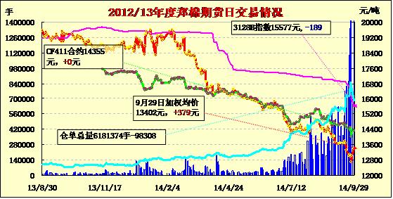 9月29日,鄭棉CF1501合約高開(kāi),早盤(pán)在平倉(cāng)盤(pán)打壓下走低,午后空頭集中回補(bǔ),推動(dòng)期價(jià)大幅上揚(yáng),日線(xiàn)形成高開(kāi)1/2下影線(xiàn)的長(zhǎng)陽(yáng)線(xiàn),日內(nèi)成交量創(chuàng)新高,持倉(cāng)量大幅減少?;久媲闆r:據(jù)調(diào)查,9月20-25日阿克蘇地區(qū)棉籽到廠(chǎng)銷(xiāo)售價(jià)約1.86-1.90元/公斤,西大橋某兩家軋花廠(chǎng)加工后積極銷(xiāo)售棉籽,買(mǎi)家為阿克蘇周邊榨油廠(chǎng);但26-28日棉籽價(jià)格普降0.10-0.15元/公斤,由于大部分油廠(chǎng)農(nóng)發(fā)行、信用社貸款沒(méi)有批下來(lái),因此市場(chǎng)成交寥寥無(wú)幾。另悉,由新疆自治區(qū)發(fā)改委訂做的“目標(biāo)價(jià)格改革棉花企業(yè)”牌子已陸續(xù)發(fā)放到各縣一級(jí)發(fā)改委,少數(shù)企業(yè)已拿到手,農(nóng)民交售籽棉時(shí)必須亮明“身份”,解除棉農(nóng)顧慮,加快籽棉收購(gòu)進(jìn)度。