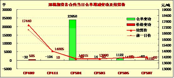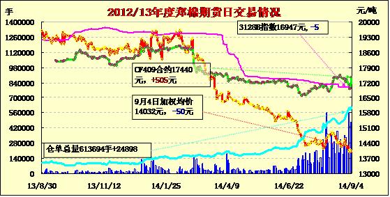 9月4日,鄭棉CF1501合約高開,早盤橫向震蕩,午后受空頭賣盤打壓下跌,日線形成陰線,日內(nèi)成交量萎縮,持倉量增加?;久媲闆r:9月1-2日阿克蘇棉區(qū)底桃僅零星吐絮,中期花坐桃率達到70%-80%,長勢較好品種單株棉桃達到12-13個,一些中早熟品種伏期桃已少量吐絮,一般一茬或兩茬采摘就可以結(jié)束,但很多中熟、晚熟品種蓋頂花開得非常好,中期桃子也相對較好,但由于近幾年南疆大多11月上旬下霜,農(nóng)民擔(dān)心大量的蓋頂桃無法吐絮甚至坐桃。近日阿克蘇大部棉區(qū)氣溫13-31度,晝夜溫差拉大,而且個別棉區(qū)陣雨增多,棉花品質(zhì)、長度或?qū)⑾陆担r(nóng)民大面積采摘預(yù)計要推遲到9月20日-11月中旬,一些棉企表示,由于棉農(nóng)同軋花廠的心理預(yù)期相差近1元/公斤,因此開秤初期農(nóng)民不賣,軋花廠不敢收的僵持時間或比較長,不排除出現(xiàn)棉農(nóng)“賣棉難”的情況。