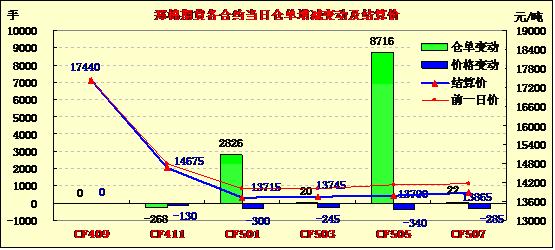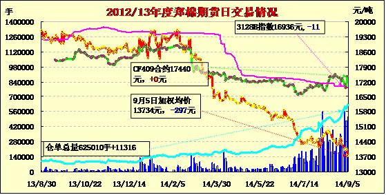 9月5日,鄭棉CF1501合約平開,早盤增倉下滑后橫向整理,午后受空頭賣盤與多頭止損盤打壓下跌,日線形成陰線,日內成交量放大,持倉量增加?;久媲闆r:9月1-2日阿克蘇棉區(qū)底桃僅零星吐絮,中期花坐桃率達到70%-80%,長勢較好品種單株棉桃達到12-13個,一些中早熟品種伏期桃已少量吐絮,一般一茬或兩茬采摘就可以結束,但很多中熟、晚熟品種蓋頂花開得非常好,中期桃子也相對較好,但由于近幾年南疆大多11月上旬下霜,農民擔心大量的蓋頂桃無法吐絮甚至坐桃。近日阿克蘇大部棉區(qū)氣溫13-31度,晝夜溫差拉大,而且個別棉區(qū)陣雨增多,棉花品質、長度或將下降,農民大面積采摘預計要推遲到9月20日-11月中旬,一些棉企表示,由于棉農同軋花廠的心理預期相差近1元/公斤,因此開秤初期農民不賣,軋花廠不敢收的僵持時間或比較長,不排除出現(xiàn)棉農“賣棉難”的情況。