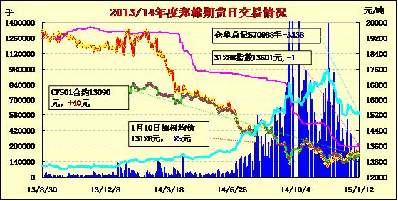 1月12日,隔夜鄭棉CF1505合約區(qū)間震蕩,今日早盤在多頭平倉(cāng)和空頭賣盤壓制下調(diào)整,日線形成小陰線,日內(nèi)成交量與持倉(cāng)量變化不大?;久媲闆r:近期棉企籽棉收購(gòu)基本正常,質(zhì)量較好的籽棉收購(gòu)價(jià)格比較穩(wěn)定。但由于尾期花上市,棉農(nóng)和棉販子交售的籽棉中既有前期的中花,又有后期的尾花、霜黃棉及部分雨銹棉,棉企普遍加強(qiáng)質(zhì)檢,給出的收購(gòu)價(jià)也高低懸殊。白棉3級(jí)、含水13點(diǎn)以內(nèi)、40斤衣分的籽棉收購(gòu)價(jià)穩(wěn)定在3.08-3.10元/斤,霜黃棉和瓣子定價(jià)較低,在2.00-2.70元/斤范圍內(nèi)。
