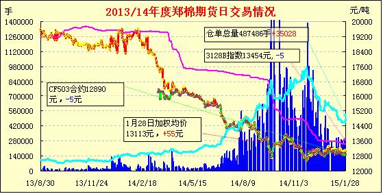 1月28日,隔夜鄭棉CF1505合約沖高后調(diào)整,今日盤中橫向震蕩,尾盤在多頭買盤推動下收高,日線形成長陽線,日內(nèi)成交量萎縮,持倉量增加?;久媲闆r:目前安徽省安慶棉區(qū)的18家400棉企已有10余家停收,原打算農(nóng)歷臘月24放假的部分棉企選擇了提前放假。主要是考慮到以下幾方面因素:一是雨雪天氣對棉花收購、加工形成了一定難度;二是后期的籽棉中霜黃棉比例增加,而且水分加大,質(zhì)量難以把控;三是皮棉市場依舊低迷。原預(yù)計在春節(jié)前,下游紡織企業(yè)要加大補庫力度,但事實上紡織企業(yè)依然是隨用隨買。除了白棉3級以上、馬值在4.2-4.6的優(yōu)質(zhì)棉比較搶手外,其他大路貨仍然無人問津,難以出手;四是臨近春節(jié),企業(yè)考慮既然不能進行生產(chǎn),還不如提前放假,讓工人回家為春節(jié)做準(zhǔn)備;五是出于安全考慮,正、蠟月在農(nóng)村里喜事多。燃放煙花爆竹不利于安全生產(chǎn)。