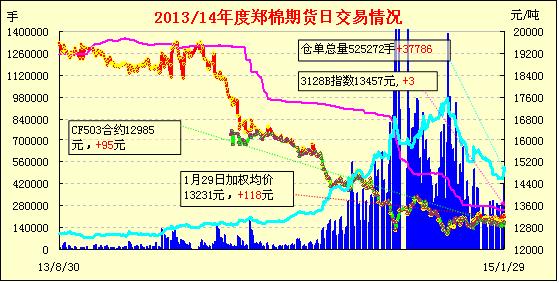 1月29日,隔夜鄭棉CF1505合約上漲,今日盤中震蕩上行,盤中換手量較大,尾盤在短線平倉(cāng)盤壓制下調(diào)整,日線形成陽線,日內(nèi)成交量放大,持倉(cāng)量增加?;久媲闆r:據(jù)安徽省氣象臺(tái)1月29日6點(diǎn)將暴雪預(yù)警信號(hào)有橙色降低為黃色,12小時(shí)內(nèi)沿江到江南北部部分地區(qū)降雪量達(dá)到6毫米以上。安徽池州地區(qū)雖然尚沒有出現(xiàn)降大雪,但一直小雨夾雪不停,北風(fēng)3級(jí)左右,濕度達(dá)97%。受此影響籽棉雖仍有報(bào)價(jià),但收購(gòu)工作基本無法進(jìn)行。截止1月29日,籽棉收購(gòu)價(jià)格不變,3級(jí)基本保持在3.10元/斤左右,4級(jí)也保持在3.00元/斤左右(衣分39%、水分12%、雜質(zhì)1.3%),棉販的報(bào)價(jià)也保持在2.95元/斤。由于小雨夾雪下不停,導(dǎo)致空氣濕度過大,皮棉加工水分難以控制,池州部分企業(yè)決定暫時(shí)停止加工,待天氣好轉(zhuǎn)氣溫回升再抓緊加工。