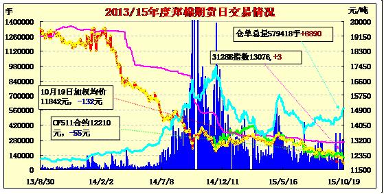 10月19日,隔夜鄭棉CF1601、1605合約弱市盤(pán)整后收跌,今日早盤(pán)小幅反彈后繼續(xù)下滑,尾盤(pán)空頭回補(bǔ)支撐下反彈,日線(xiàn)形成陰線(xiàn),日內(nèi)遠(yuǎn)月成交量放大,持倉(cāng)量近減遠(yuǎn)增?;久媲闆r:阿克蘇沙雅、新和、庫(kù)車(chē)等地棉企表示,近兩年國(guó)家全面退出棉花收儲(chǔ)政策以后,棉花現(xiàn)貨成交幾乎都是毛重結(jié)算,適度加大籽棉回潮率有利于軋花廠(chǎng)降低成本。據(jù)了解,截止10月18日前后,喀什的巴楚、麥蓋提等主產(chǎn)棉區(qū)籽棉采摘進(jìn)度已達(dá)到65%-70%,棉農(nóng)、棉花經(jīng)紀(jì)人銷(xiāo)售進(jìn)度約45%-50%,約70%-75%的軋花廠(chǎng)開(kāi)秤收購(gòu)。而阿克蘇沙雅、阿瓦提、新和、烏市等主產(chǎn)區(qū)籽棉采摘進(jìn)度約55%,交售進(jìn)度則不足45%,庫(kù)爾勒尉犁、普惠、輪臺(tái)等棉區(qū)籽棉采摘達(dá)到45%以上,但交售進(jìn)度達(dá)到40%。