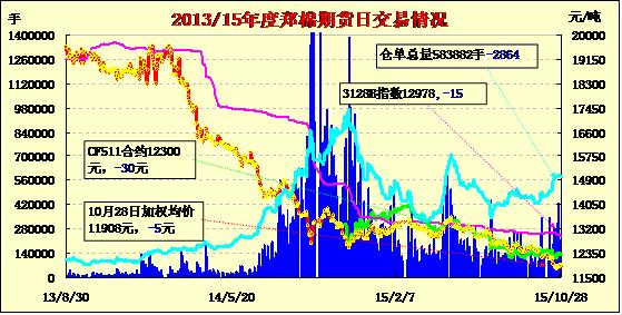 10月28日,隔夜鄭棉CF1601、1605合約短線沖高,今日盤中橫向震蕩,遠月形成盤跌走勢,CF1601合約日線形成小陽線星,CF1605合約日線形成小陰線,日內近月成交量萎縮,持倉量近減遠增?;久媲闆r:10下旬以來,雖然內地棉紡織廠、經(jīng)營商及絮棉企業(yè)詢價、看貨、成交積極性不高,皮棉現(xiàn)貨在疆內監(jiān)管倉庫已“棉滿為患”,但達到“雙28”“雙29”的31級、21級毛重提貨價仍在12700-13000元/噸、13100-13300元/噸,北疆3128級機采棉的報價也穩(wěn)定在12300-12600元/噸,兵團機采棉報價高于地方企300-400元/噸。疆內一些軋花廠表示,由于北疆9月份以來遭遇兩次較大范圍內的降溫降水天氣,皮棉品級以31級為主,21級的比例較2014/15年度下滑非常明顯,中期花28mm、29mm長度的比例一般在50%-60%,強力28CN及以上的批次也很常見。石河子、昌吉、奎屯等地棉企表示,中期手采棉的各項紡紗指標并不輸于機采棉,“好酒不怕巷子深”,短絨率低、雜質小及一致性好等優(yōu)勢決定了高等級手采棉市場前景仍很廣闊。